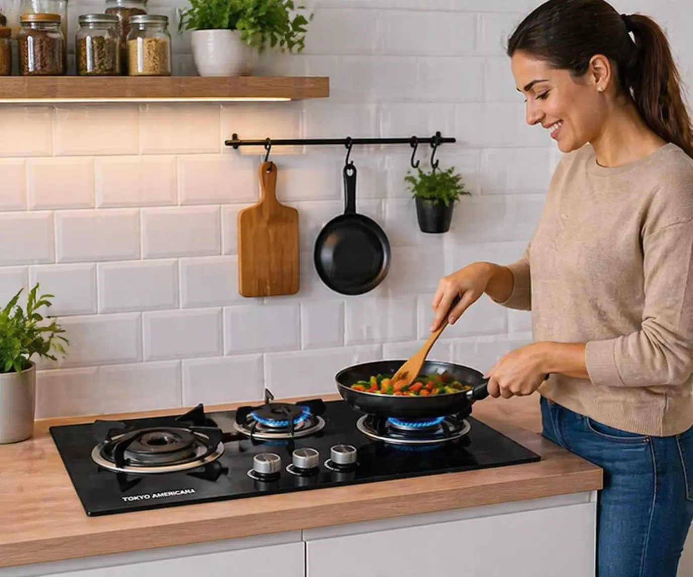 Triple Quemador: Cuenta con una hornalla central potente de 13 cm de diámetro y dos laterales de 7.5 cm, adaptándose a todas tus ollas y necesidades.