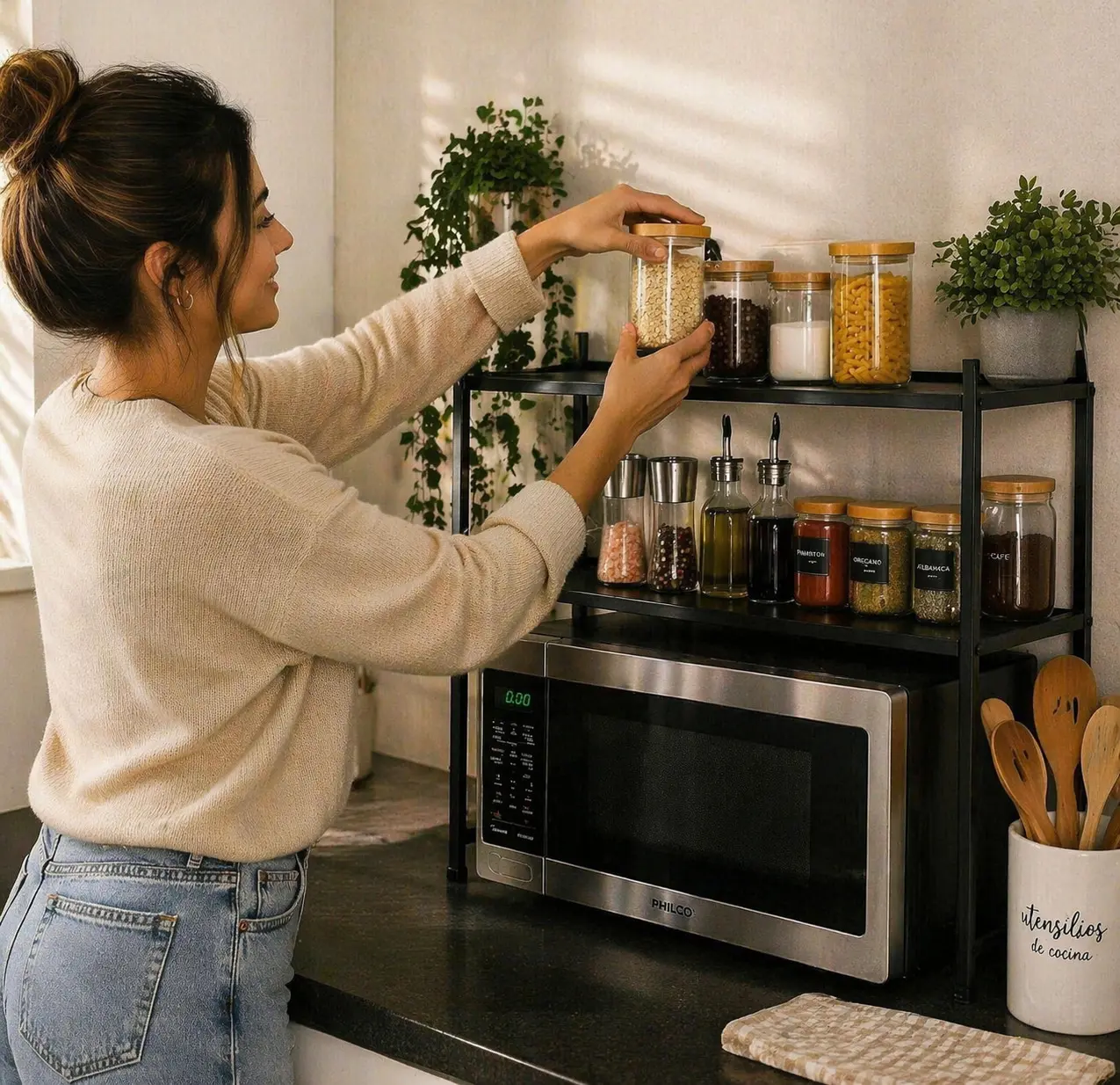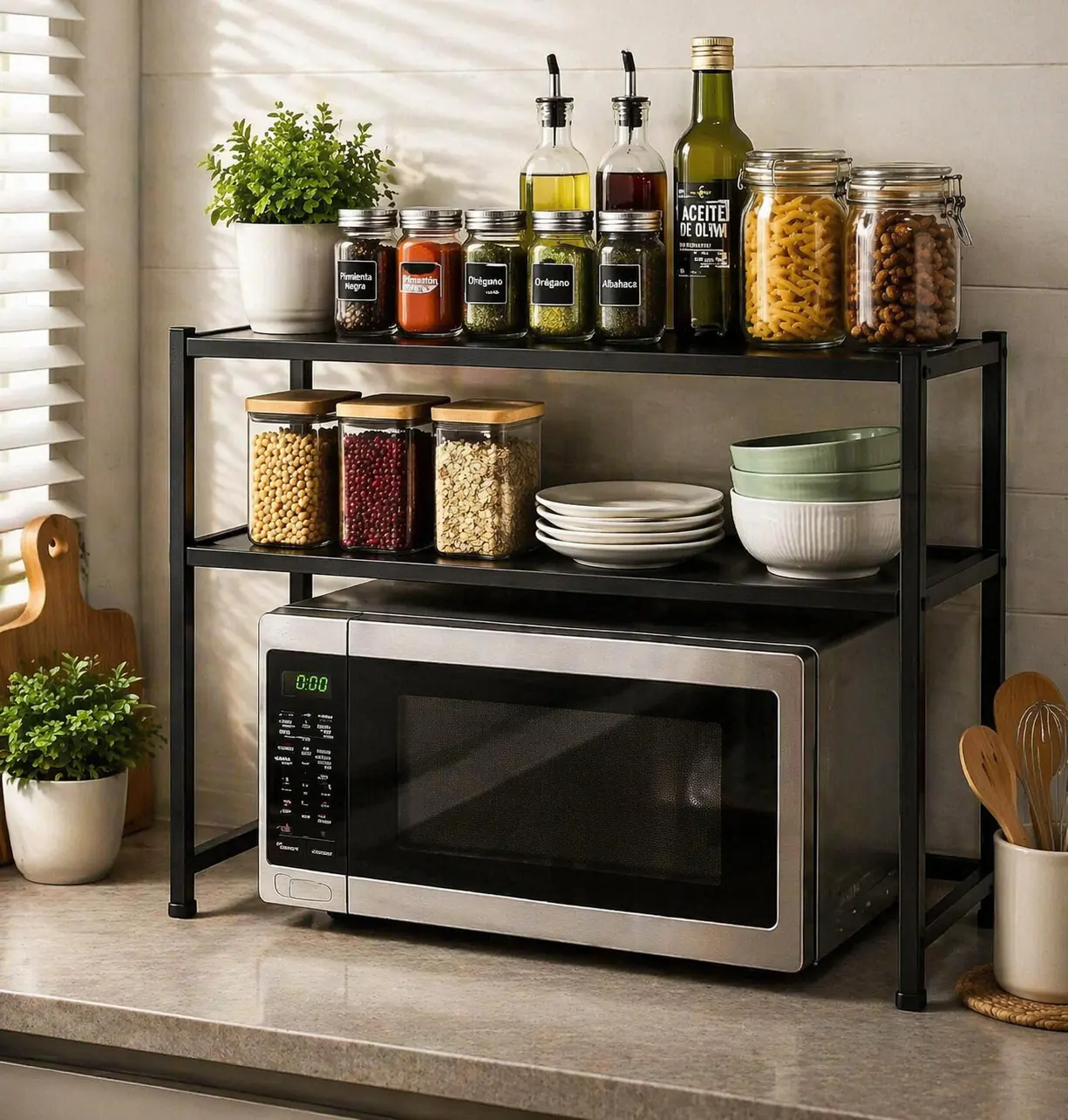 Versatilidad Total: No solo es ideal para el microondas; su diseño permite usarlo en diferentes áreas del hogar donde necesites orden extra y una estructura reforzada.